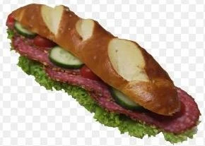 Leckeres Laugenstangen-Sandwich mit Butter, Rindersalami, Tomate und Lollo-Bionda-Salat.