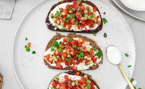 Getoastetes Ciabatta mit veganer Streichcreme und gegrilltem Antipastigemüse.