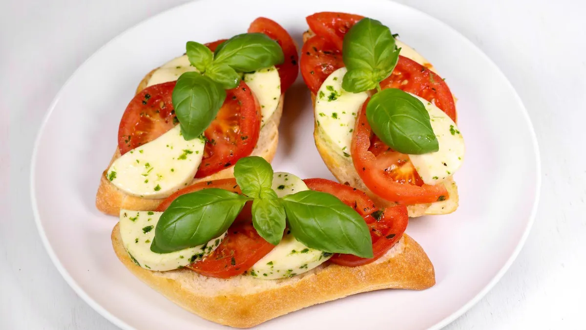 Frisches Bruschetta aus Tomaten, Basilikum, Knoblauch, Zwiebeln und Olivenöl auf bzw. Ciabattabrot.