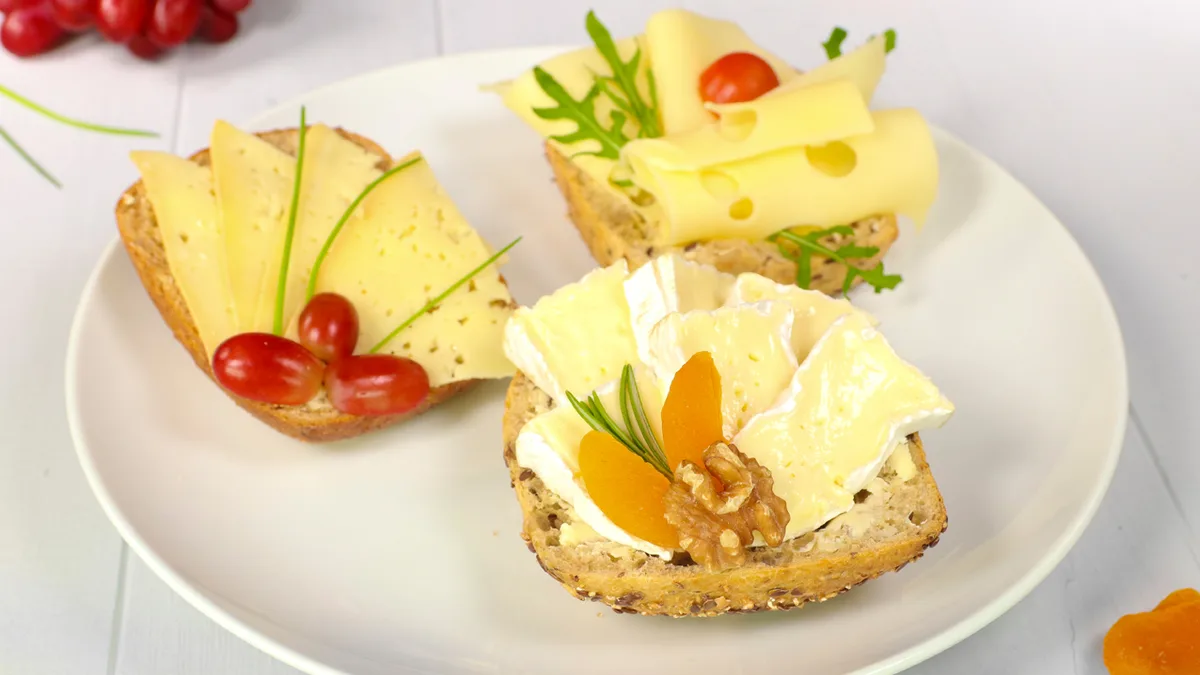 Käsespieße mit jungem Gouda, jeweils mit Traube oder Olive.