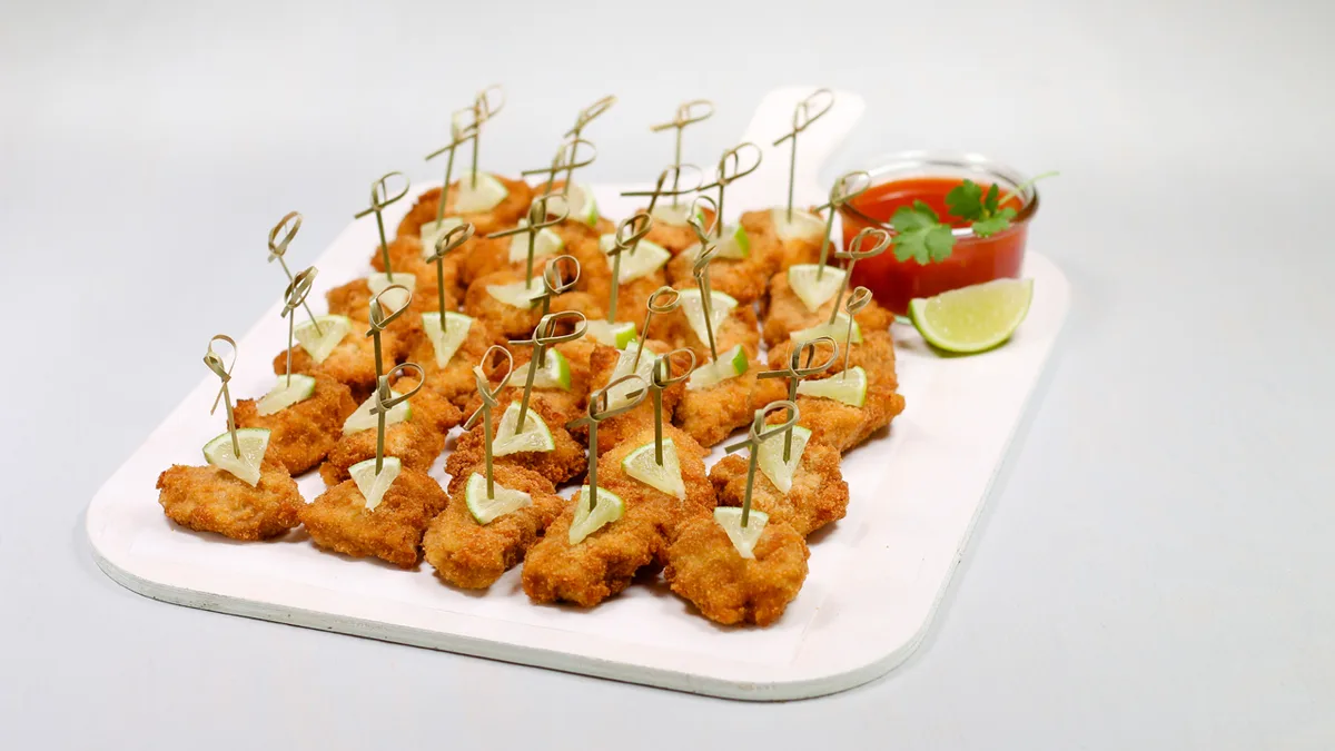 Frittierte Mini-Schnitzel aus Hähnchenfleisch in knuspriger Panade.