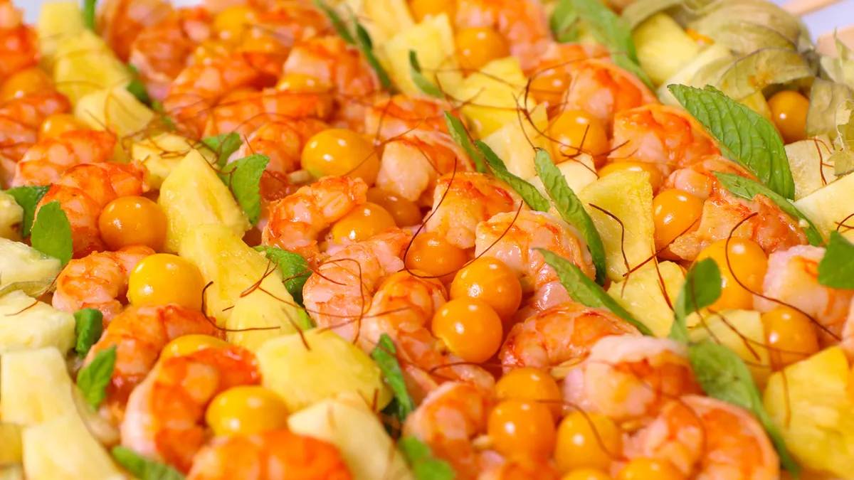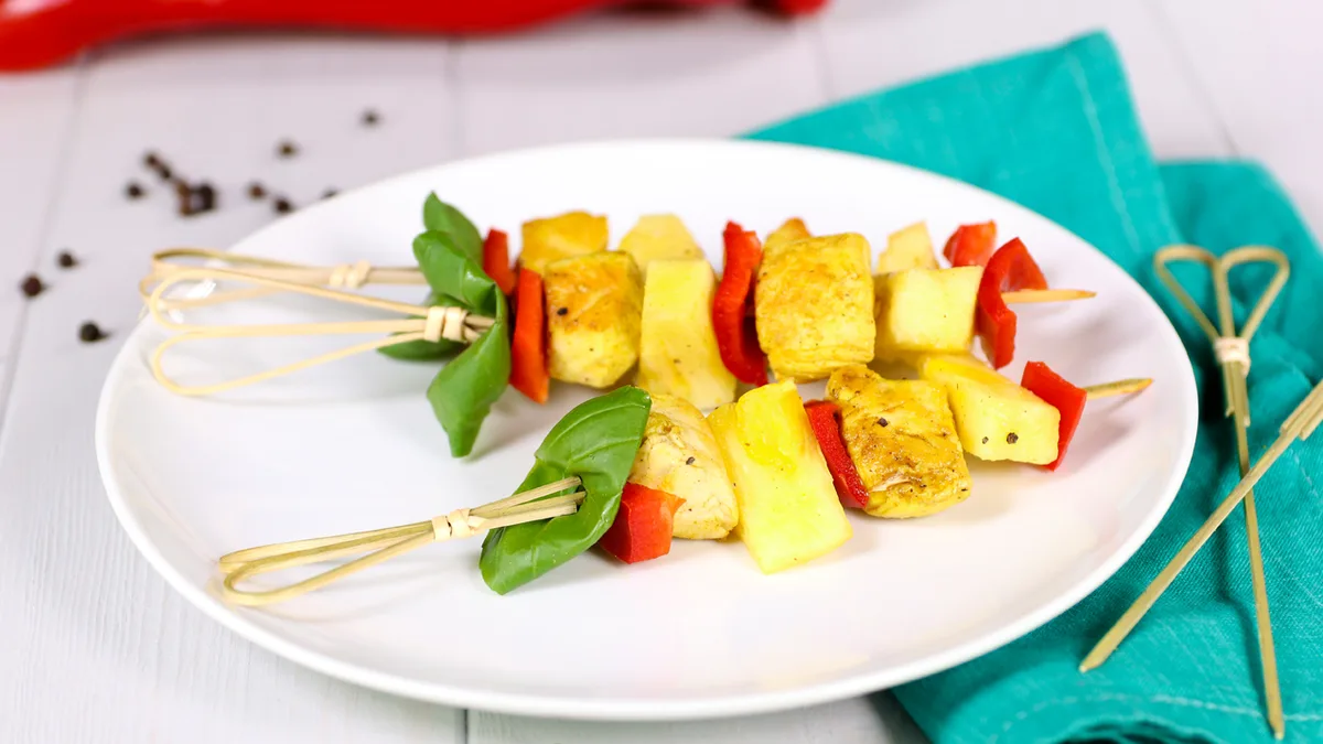 Gebratenes Hähnchenbrustfilet mit frischer Ananas am Spieß.