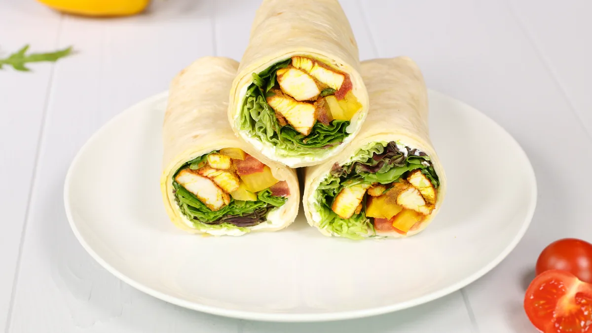 Tortilla Wrap gefüllt mit Hähnchenfleisch, Salat, Paprika, Tomate, Gurke und Frischkäse.