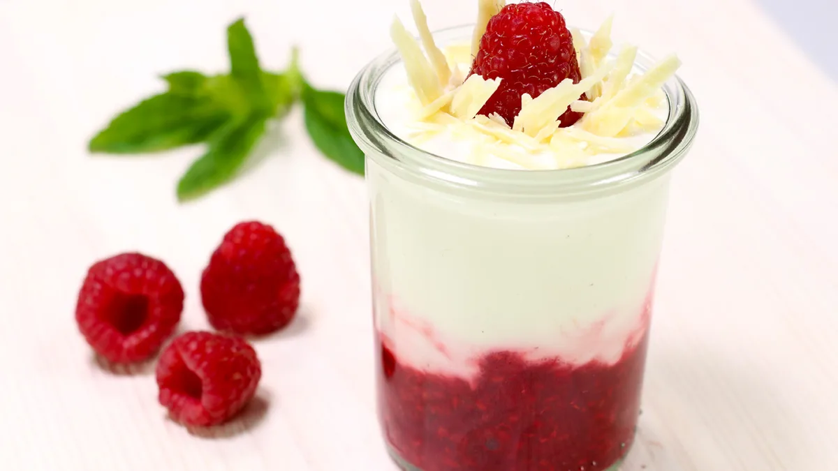 Ein leckeres, veganes Dessert aus cremigem Kokosnusspudding mit natürlicher Süße und saftigen reifen Himbeeren in einem Glas.