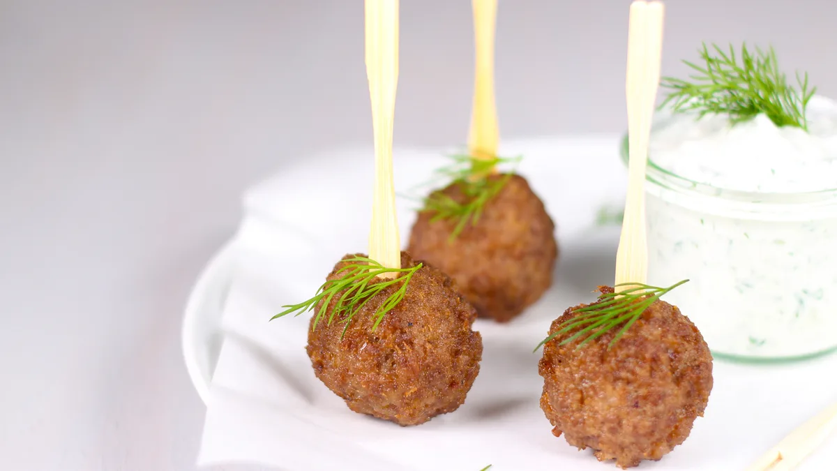 Kleine Fleischbällchen aus Rinder-Hackfleisch, dazu Salsa-Dip.