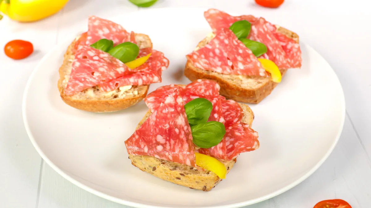 Halbe Brötchen belegt mit Rindersalami-Aufschitt und Lollo-Salat, mit Essiggurke verfeinert.