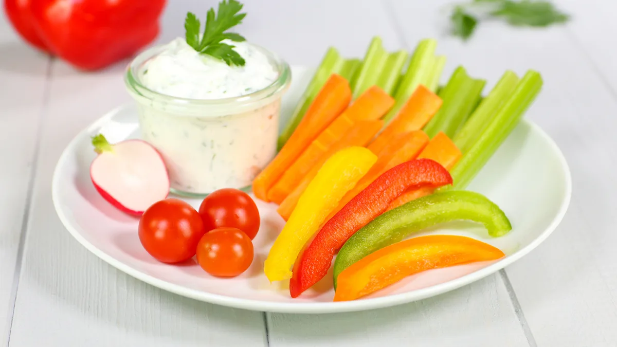 Verschiedene Bio-Gemüsesticks von Sellerie, Karotten, Paprika und Gurken, dazu Kräuter-Schmand-Dip.