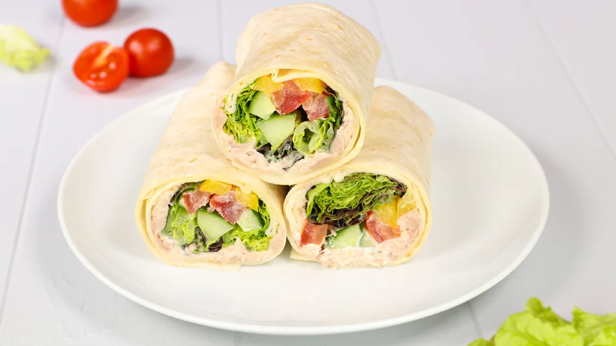 Tortilla Wrap gefüllt mit Thunfisch, Salat, Tomate, Paprika, Gurke und Frischkäse.