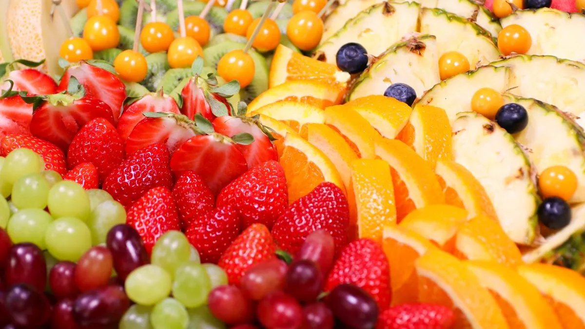 Frisches Obst der Saison wie Ananas, Orangen, Honigmelone, Weintrauben oder Kiwi, dekorativ auf einer Platte angerichtet.