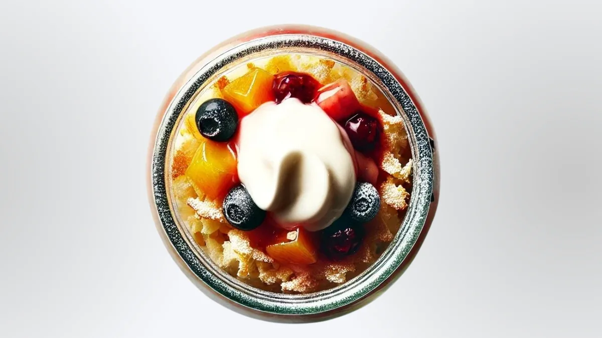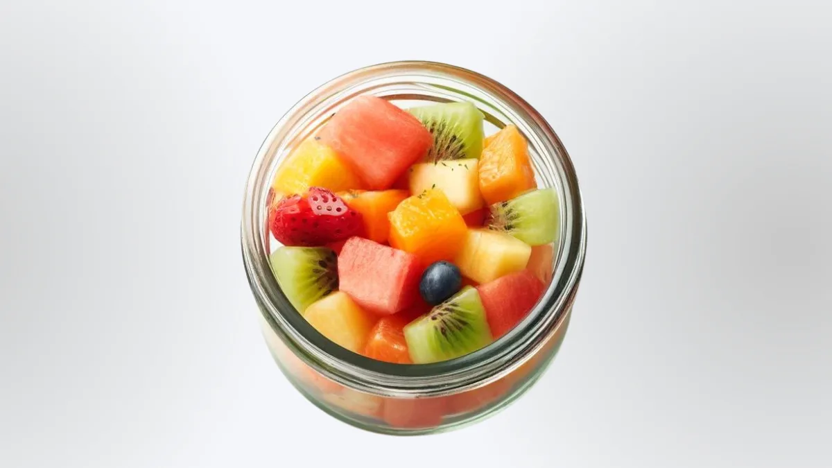 Frischer Obstsalat aus saisonalem Obst im Glas.