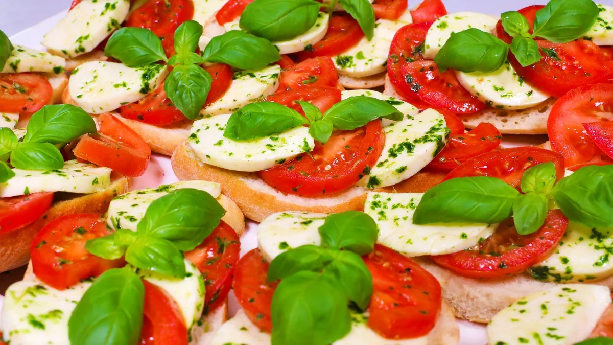 Die halben Brötchen werden belegt mit Tomaten- und Mozzarellascheibe und mit Pesto und Basilikum garniert.