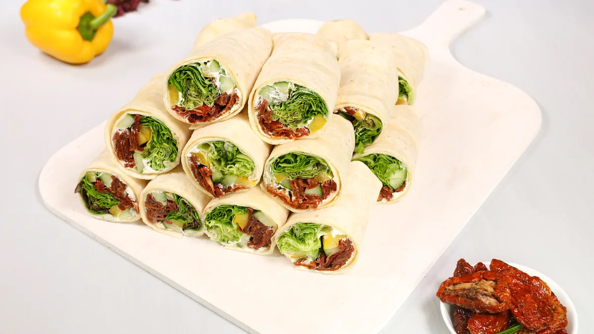 Tortilla Wrap lecker gefüllt mit getrockneten Tomaten, Salat, Paprika, frischer Tomate, Gurke und Frischkäse.