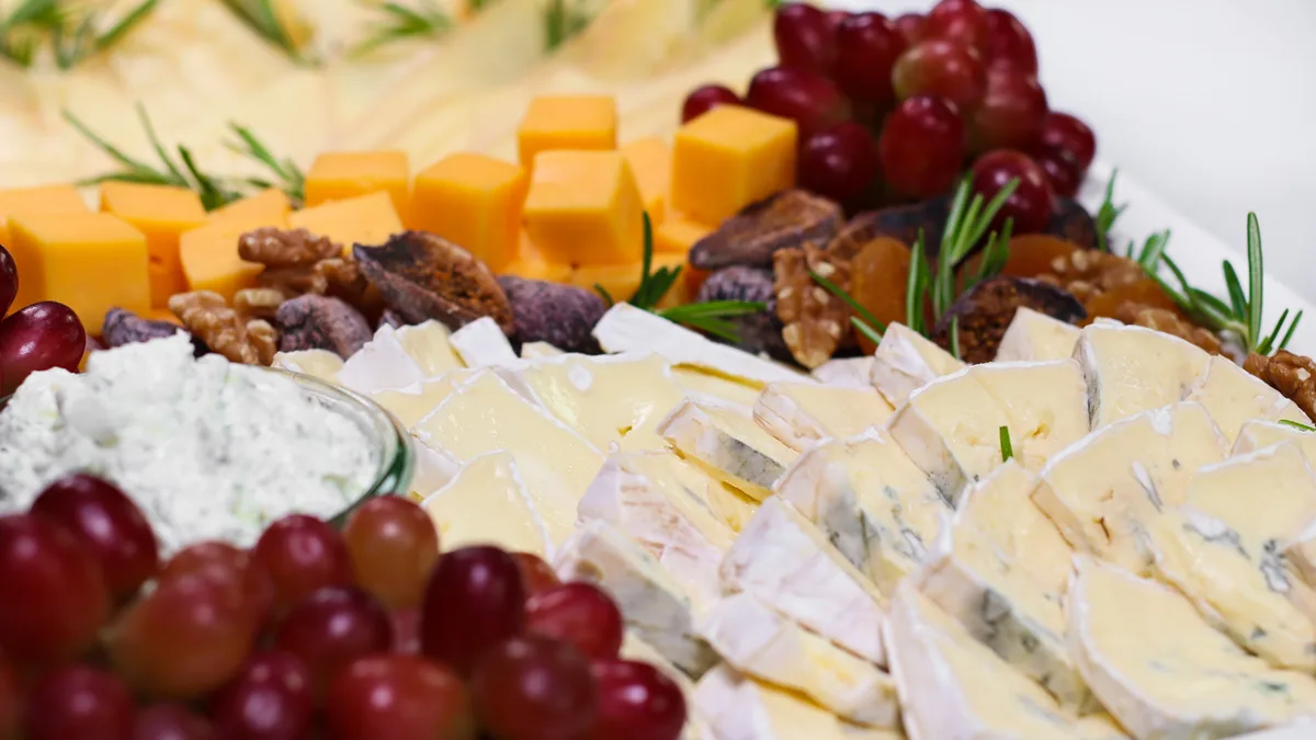 Eine Auswahl verschiedener Käsesorten wie zum Beispiel junger Gouda, Camembert und Blauschimmelkäse, dazu Baguette, Feigensenf und Weintrauben