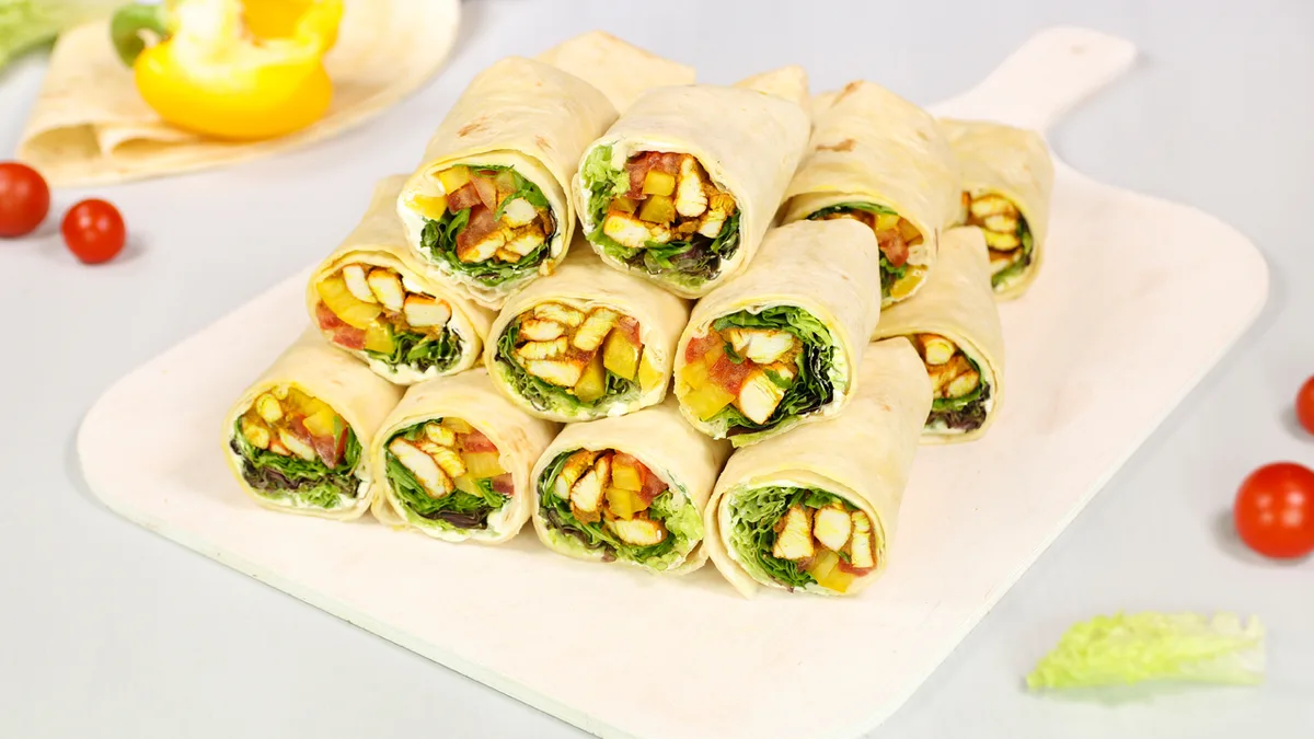Eine Portion beinhaltet einen halben Wrap. 4,90 € pro Portion (min 10) zzgl. MwSt.