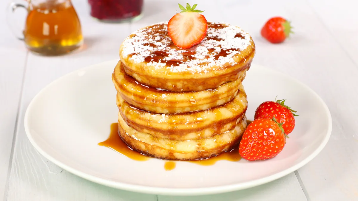 Pfannkuchen mit Ahornsirup, Puderzucker, saisonalen Beeren und süßem Aufstrich
