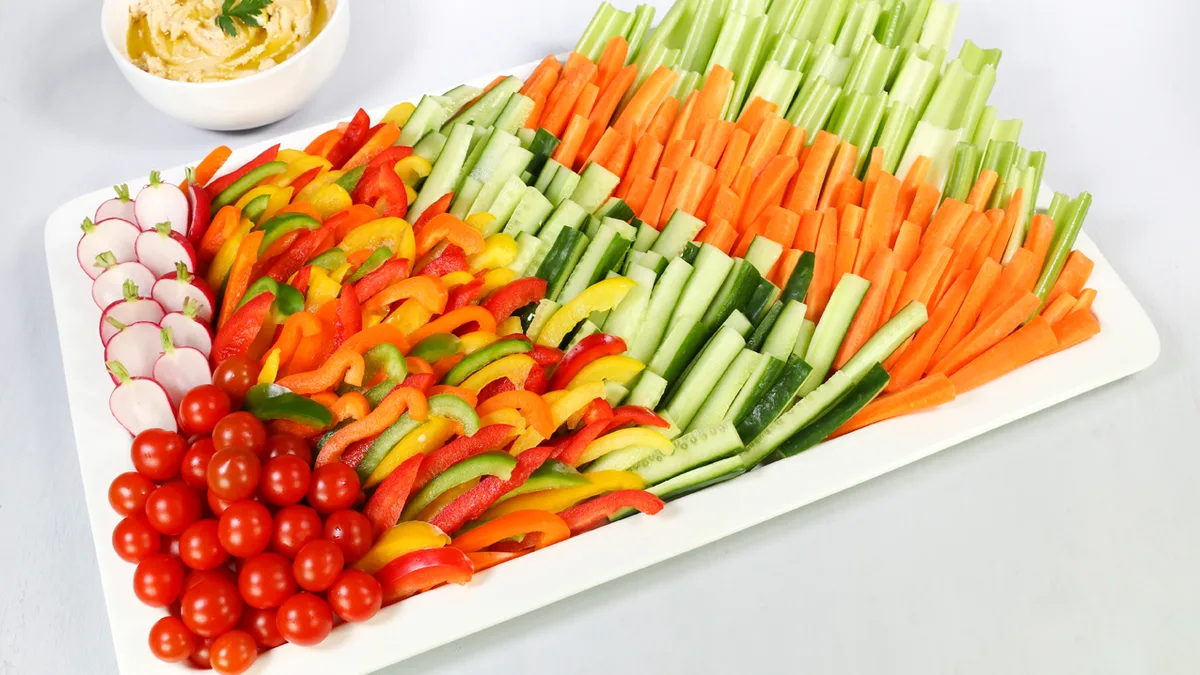 Verschiedene Bio-Gemüsesticks aus Sellerie, Karotten, Paprika und Gurken, dazu Hummus aus Kichererbsen.