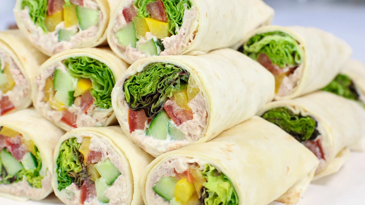 Tortilla Wrap lecker gefüllt mit Thunfisch, Salat, Tomate, Paprika, Gurke und Frischkäse.