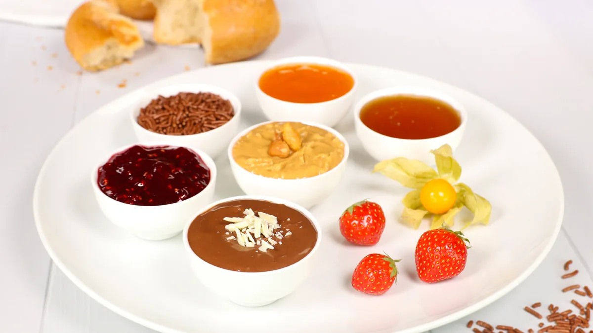 Eine Auswahl an süßen Aufstrichen: Erdnusscreme, Nuss-Nougat-Creme, Honig, Marmelade und Schokostreusel